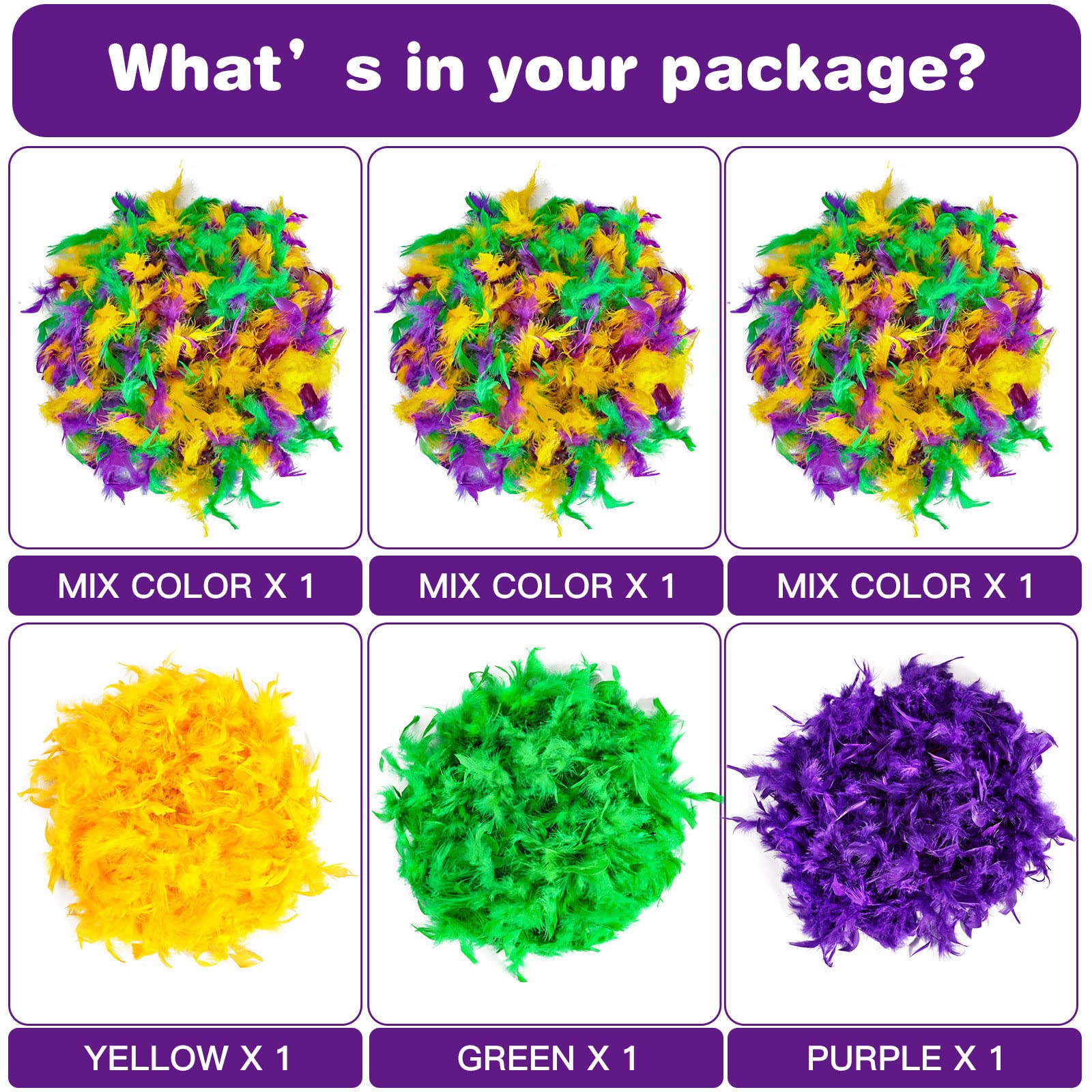 - Exclusive 6pcs Mardi Gras Party Decoration Set: This colorful party feather boas includes 6 boa - 1 Yellow, 1 Green, 1 Purple, 3 Mixed color(Yellow+Green+Purple), full enough to meet all your needs.