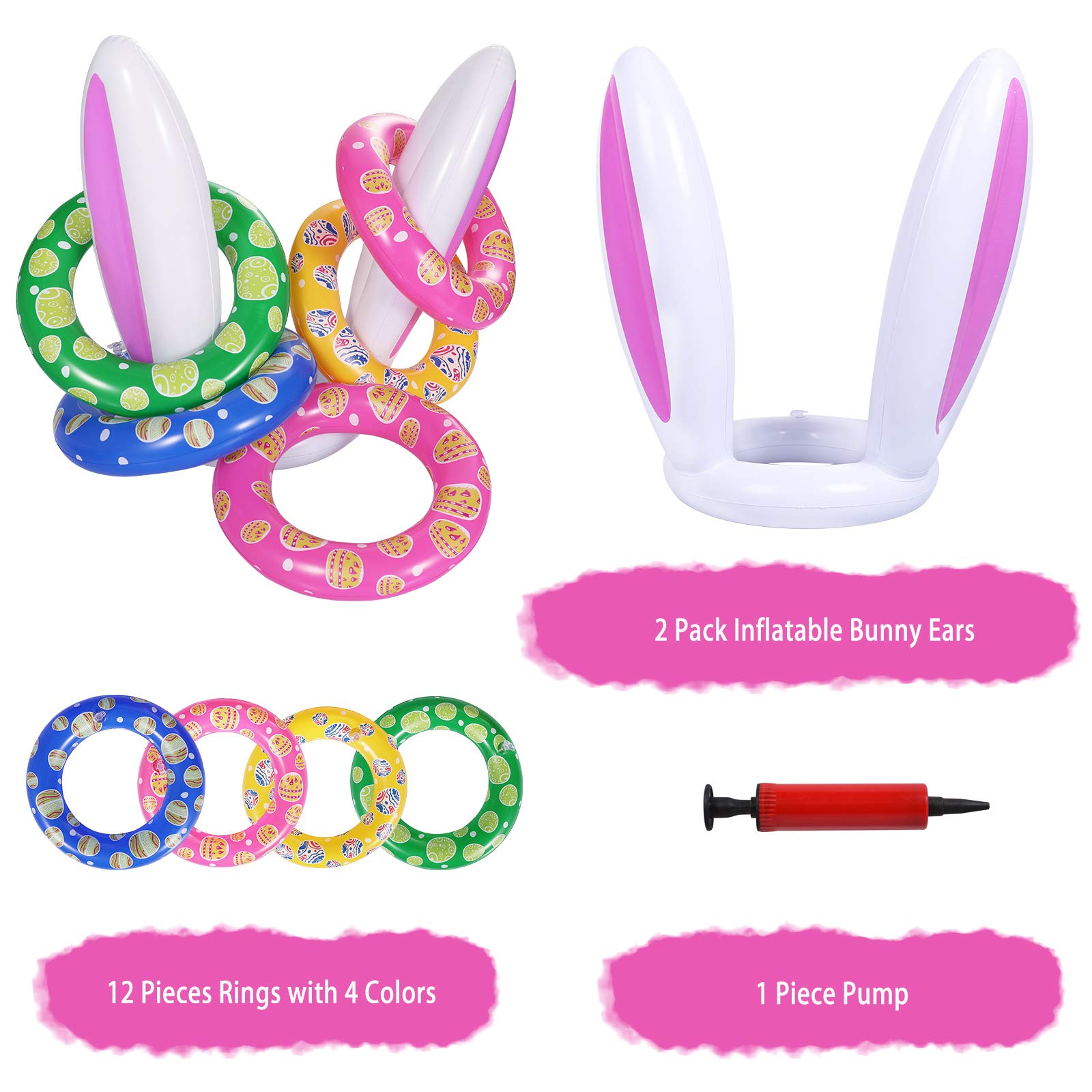 - Complete Inflatable Ring Toss Set: Includes 12 ring toss rings, 2 inflatable bunny ears, and 1 pump. Simply blow up the inflatable bunny ears and start playing this exciting Easter ring toss carnival game for kids and family gatherings. Bunny Ears sizes are 14.96 x 9.44 inches. Rings are 7.67 inches. Meet US Toy Standard. EN71 Test Approved.